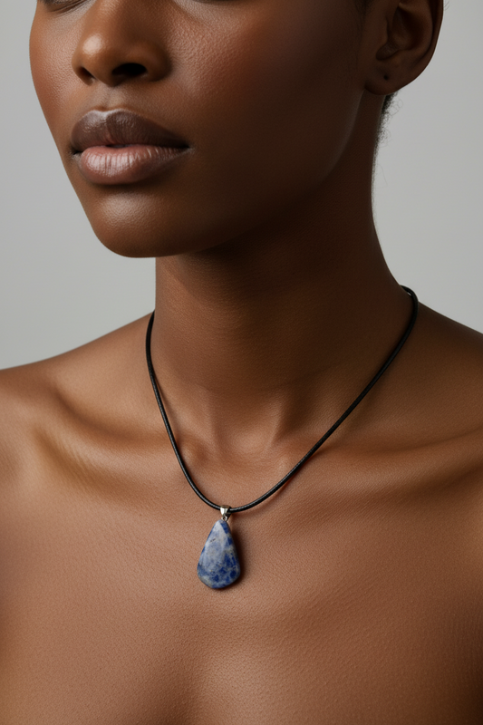 Sodalite Necklace - Deep Calm - Black Leather Rope - Throat & Third Eye Chakra