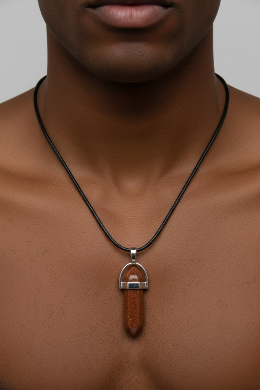 Red Goldstone Necklace - Stone of Ambition - Sparkle & Drive - Black Leather Rope